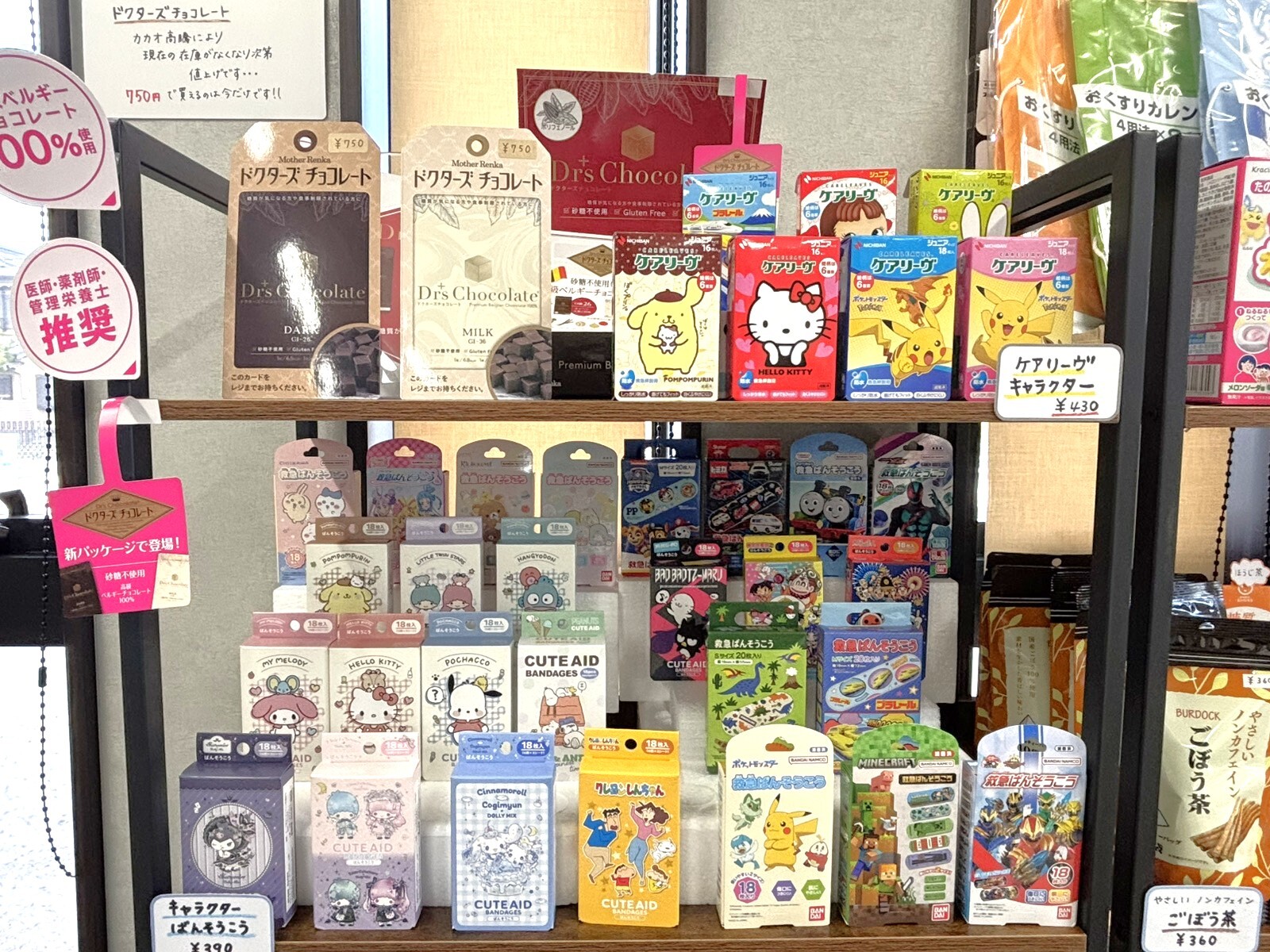 人気キャラクターの絆創膏なども販売しております。